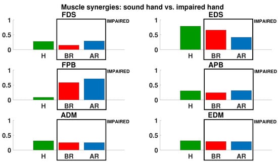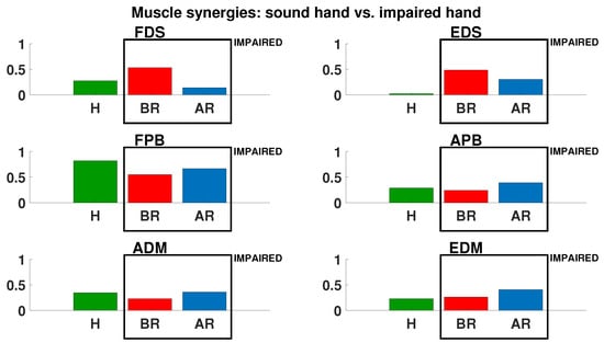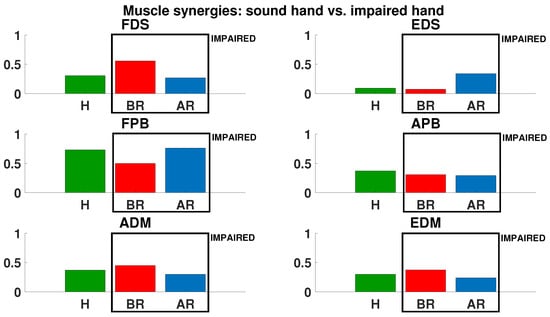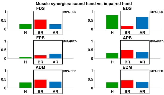 Muscle synergies were extracted and compared with the recorded EMG data of the 7 muscles selected at the beginning and at the end of the treatment on each subject and on the contralateral limb. Since the synergies are subject-specific, multiple comparisons were made between the beginning and the end of the rehabilitation treatment of the affected and the sound hands. For the sake of brevity, the results concerning contributions of each muscle synergy are shown, for a representative subject, in Figure 6, Figure 7, Figure 8 and Figure 9. Similar results were obtained for the other involved subjects. In particular, the first bar is the rate of the corresponding muscle in the healthy limb (H), and the second and the third bars are the rate of each muscle before and after rehabilitation (BR and AR), respectively.