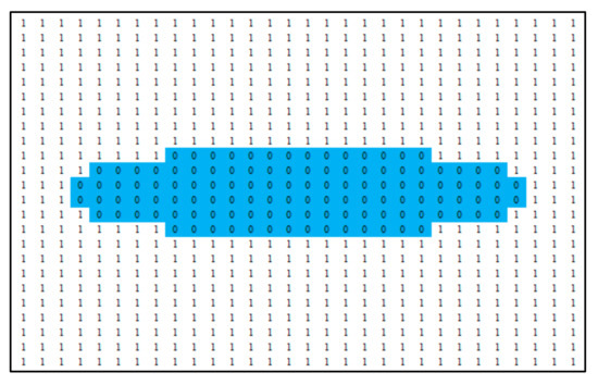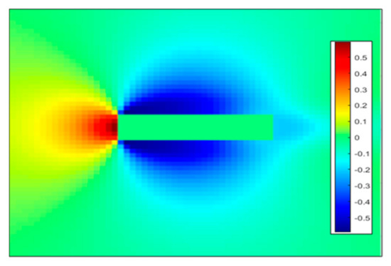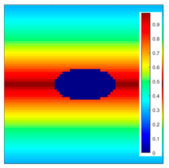 Donglin Chen sets the internal aerodynamic shape to 1 and the external to 0 to express the aerodynamic shape, then uses it as the model input for training. Since the sampling area in this paper is large to ensure the normal training of the model, the internal aerodynamic shape is set to 0 and the external is set to 1 to express the aerodynamic shape as the model input. In this paper, three distance fields (, and ) are innovatively proposed to express the aerodynamic shape and flow field information. This paper uses the UNet model determined in Chapter 6 and exactly the same parameters for training and compares the accuracy of the drag coefficient to illustrate that the three distance fields (, and ) proposed in this paper can effectively improve the prediction accuracy of the model. Taking an ellipse with an aspect ratio of 4 as an example, the 0–1 distance field is shown in Figure 12. The average relative error of the drag coefficient of each basic shape predicted by the model is shown in Table 5.