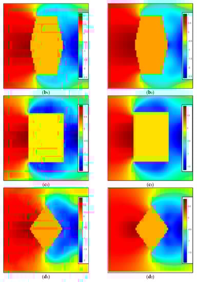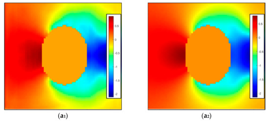Comparison of pressure field prediction effects of four typical shapes. The first column is the predicted value. (a1) The ellipse with AR = 0.71. (b1) The hexagon with AR = 0.56 R = 0.3. (c1) The rectangle with AR = 0.71. (d1) The diamond with AR = 0.71. The second column is the true value. (a2) The ellipse with AR = 0.71. (b2) The hexagon with AR = 0.56 R = 0.3. (c2) The rectangle with AR = 0.71. (d2) The diamond with AR = 0.71.