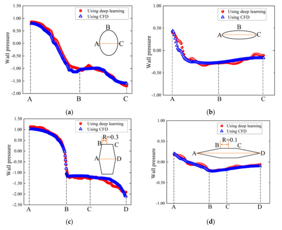 Wall pressure is of great significance in the evaluation of aerostatic performance and can also be used to extract third-component force coefficients. Figure 11 shows the comparison of the wall pressure prediction results and the CFD calculation results. Due to space limitations, only four typical shapes and two for each shape are shown. Since the shapes used in this paper are all symmetrical up and down, only the wall pressure in the upper part is shown.