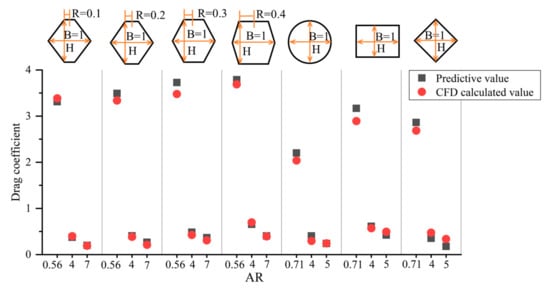Considering that the drag coefficients of different shapes are quite different, the average relative error is used to comprehensively evaluate the prediction accuracy of different shapes, as shown in Table 6. At the same time, the comparison between the predicted drag coefficient and the CFD-calculated drag coefficient for each shape is shown in Figure 14.