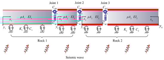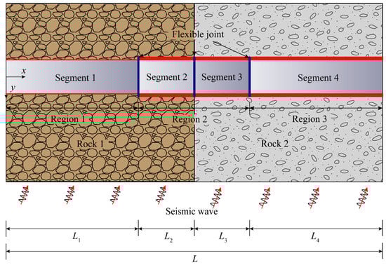 In this section, a simplified analytical solution is developed to evaluate the responses of a tunnel with flexible joints through a soft-hard stratum junction under earthquake motion, as shown in Figure 1. A tunnel with three regions is designed where the two regions on the right side are thickened, which is often adopted for the sudden change in rock type and soft rock. In addition, the flexible connection is set between the regions. The transition Region 2 consists of two segments and the flexible connection is also set between them, which is intended to mitigate the influence of the sharp change in properties of the surrounding rock on the tunnel responses. The other two regions, which consist of one segment each, are embedded in hard layer (Rock 1) and soft layer (Rock 2), respectively. Note that Rock 1 is harder than Rock 2. To simplify the problem, the tunnel is assumed to behave as a shear beam on viscoelastic foundation. The following assumptions are made: