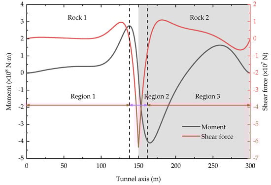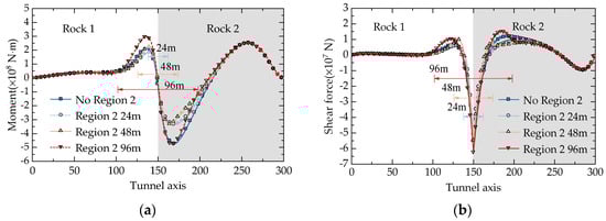 In practice, a transition tunnel is often included to mitigate the potential adverse effects of the sharp change of ground properties. To investigate the effect of the length of the transition zone, four cases with different length of the transition zone are investigated, with values of 0 m, 24 m, 48 m and 96 m, considering that the length of the concrete trolley in tunnel construction is generally 9 m or 12 m at present. Note that 0 m indicates that no Region 2 is considered. Figure 8 shows the maximum bending moment and shear force of the tunnel structure under the different scenarios discussed. The minimum value of bending moment occurs when the length of Region 2 is 36 m, followed by the length of Region 2 being 24 m and 48 m, where the maximum bending moments are very close to each other. In terms of the shear force, the Region 2 of 24 m has the minimum value, and the one with 36 m is 2.55% larger than that with 24 m. Therefore, the length of Region 2 with 24 m or 36 m can be taken as the optimal length.