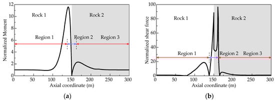 Figure 4 shows the internal force responses of a uniform tunnel across a soft-hard stratum junction (Case 1). As it can be seen, two peak bending moments occur near sharp contact, which means the sudden change of the ground layers leads to significant bending moments in the contact area of non-homogeneous layers. This phenomenon is in agreement with the finding from [19]. It is interesting to see that the largest bending moment is located at the side of soft layer near the sharp contact area, which is accordance with shaking table test results [6]. To put it another way, the most unfavorable location of the bending moment is determined by the combination of the sharp contact and the weak surrounding rock, which is the key position for aseismic design. Figure 4 shows that the maximum shear force appears at contact, and the farther from the contact, the smaller the shear force. Compared to the analytical solution and the existing research, the longitudinal responses have a lot in common, showing that the closed-form analytical solutions are accurate.