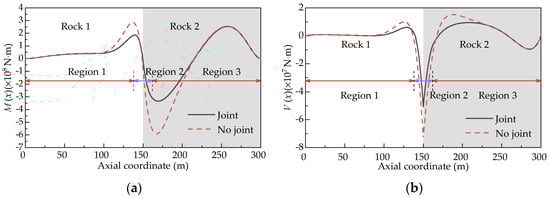 Influence of the joint on tunnel responses. (a) Bending moment; (b) shear force.