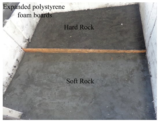 Based on the tunnel construction drawings of the tunnel and the size of the model box, the geometric similarity ratio of the model was set to 1:30, and the similarity ratio of the density and Young’s modulus were 1:1.5 and 1:45, respectively. Other similarity ratios used in this paper are listed in Table 1. After several matching tests, the ratio of the mode soil in the relatively harder rock (Rock 1) was adopted for 50:40:10 (fly ash: river sand: machine oil), and the ratio of the soft rock (Rock 2) was 57:31:12 (fly ash: river sand: machine oil). Table 2 shows the specific mechanical parameters. Before the model soil was paved, the expanded polystyrene (EPS) foam boards were stuck to the sidewall of the model box to absorb the seismic energy of the boundary reflection, as shown in Figure 9. The similar material of the surrounding rock was placed uniformly into the model box and tamped down to predetermined markings, and a board was used to control the soil interface, as shown in Figure 9.