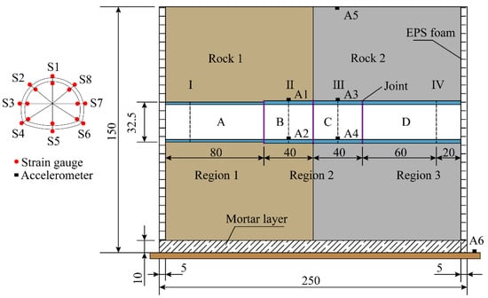 Figure 11 shows the sensor locations. The segments of the lining, from left to right, were denoted as A, B, C and D, respectively. Four monitoring sections were designed during the tests. Monitoring sections II and III were located on both sides of the interface at equal distance, and it was also the case for monitoring sections I and IV. The strain gauges were stuck on each monitoring section, both inside and outside of the lining. Monitoring sections II and IV were mainly used to investigate responses of the tunnel due to sharp change in properties of the surrounding rock. Six accelerometers were installed in the model tests and were denoted as A1, A2, A3, A4, A5 and A6, as illustrated in Figure 11. Accelerometers A1 and A2 were adopted to monitor responses of lining in hard layer, and accelerometers A3 and A4 were adopted to monitor responses of lining in soft layer. A5 and A6 were designed to monitor the surface of the surrounding rock and the input acceleration on the shaking table, respectively.