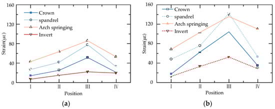 In general, the strains of monitoring section I are relatively small, which may be due to the setting of the joint and the relatively small deformation effect in the hard layer. In addition, the strains of arch springing and invert at monitoring section IV are even larger than those at monitoring section II. In terms of strains in monitoring cross sections, they have similar strain laws under excitations with different amplitudes. The strains at the spandrel and arch springing are larger than those at the crown and invert.