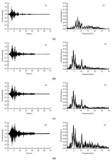 Acceleration records and Fourier spectra of monitoring positions in the shaking table tests. (a) Acceleration time history and Fourier spectrum of monitoring point A1; (b) acceleration time history and Fourier spectrum of monitoring point A3; (c) acceleration time history and Fourier spectrum of monitoring point A4; (d) acceleration time history and Fourier spectrum of monitoring point A5.