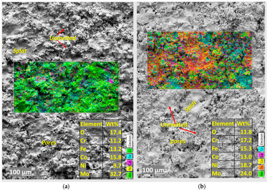 Top surface morphologies, elemental concentration and combined EDX surface map of the as-sprayed (a) LC-HEA_Mo27 and (b) LC-HEA_Mo20 coatings.