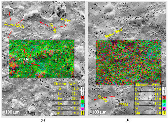 Figure 3 and Figure 4 show the top surface and cross-sectional views of the ESD-HEACs as analyzed via SEM/EDX. The top surfaces of the coatings show more micro-cracks and pores compared to the coatings prepared by the HVOF and LC techniques. However, the SEM images and the corresponding EDX maps in Figure 3a,b revealed a uniform, smooth and continuous coating. The top morphology appeared bubbly on a 1 mm scale but expanded into pinholes and soft bulges overlapping with craters, as seen in Figure 3a,b. These craters are likely formed from the shrinkage of the hot liquid pool thrusting around semi-melted or unmelted droplets from the solidifying molten pool. The surface maps show a relatively homogeneous elemental distribution of Co, Cr, Fe, Ni, Mo and O in the HEACs. However, the EDX mapped surface of the HEA_Mo27 reveals an area with increased Fe concentration in the craters and higher Co content in the droplets compared to the HEA_Mo20 (see Figure 3a,b).