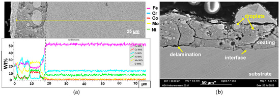 Furthermore, branched cracks originated from the bridging of the voids during solidification. Residual thermal effects and stresses most likely propagated other cracks, either parallel or perpendicular to the surface. The L/L stresses created within the coating during L/L fusion promoted the formation of cracks, which propagated vertically (see Figure 4b). Additionally, delamination cracks also formed in a direction parallel to the surface (see Figure 4b,d). Hence, delamination resulted in a weak metallurgical interlayer at the S/C interface.