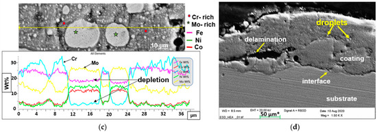 Cross-section micrographs in Figure 4 show the microstructure of the ESD HEACs. The two-phase microstructure was characterized by a single-phase dark grey matrix and a significant amount of spherical droplet particles, as shown in Figure 4. The dark grey matrix was highly oxygenated with no secondary phases present. A pulsed-arc welding process is used to build multi-pass ESD HEA layers on the substrate from individual splats of the material from the electrode. A single spot deposit using this technique has a typical ‘splash appearance’ [38]; therefore, droplet particles were likely trapped if uneven heating and electric field oscillations occurs during the manual application. The obvious difference between the coatings HEA_Mo20 compared to HEA_Mo27 (SEM micrographs of Figure 4d over Figure 4b) is the increased thickness and consolidated microstructure without the large globules indicating spraying of fine molten droplets along the discharge arc during argon shielding deposition. A homogeneously dense and adherent two-phase microstructure with no pores was reported by Karlsdottir et al. [39] for the same deposition technique as for the HEA_Mo20 (QS + Mo) coating. However, the HEA electrode was prepared by vacuum arc melting with multiple passes (3–4) in that study and thus thicker and more uniform coating was obtained. The ESD process produced a coating thickness of 23.5 ± 5 µm and 28.8 ± 6 µm for HEA_Mo27 and HEA_Mo20, respectively, which the approximated value is comparable to already reported single deposit thickness [38]. The droplet particles appear light grey in SEM/EDX analysis and are rich in Mo, although traces of Cr and O are also found. The maps and line profiles from Figure 4a,c confirmed a considerable amount of Cr, Fe and Mo in the HEACs. The Fe and Cr content increased from substrate melting and mixing in the liquid pool, which explained the craters’ high Fe content from the surface analysis (see Figure 3). The ESD process has been reported to promote Cr segregation in FeCrMo type alloys with CrxOy formation [39]. There is also evidence of this in this work, as clearly shown in the composition profile scans in Figure 4a,c, showing depletion of Fe and Cr indicated by lower wt% in the un-melted regions. The entrapped powder particles contributed to coating layer-to-layer (L/L) fusion and defects in substrate-coating interfacial (S/C). As seen in Figure 4b, spherical voids in the coating could also be generated by entrapped gas during deposition.