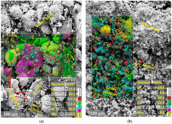 The top surface morphology showed spherical granules and loose particles lightly bonded to large lumps of semi-melted structures. The mixed coarse powder distribution and rapid solidification of the LC process may have led to uneven heating of the particles promoting an uneven surface where the particles were partially melted or maintained their shape. However, finer granules were observed on the HEA_Mo20 coatings compared to HA_Mo27 (see Figure 5) due to high melting capabilities needed with the increase in Mo. Thus, the alloy elements are not homogeneously spread on the surfaces, as seen from the EDX surface maps in Figure 5a,b.