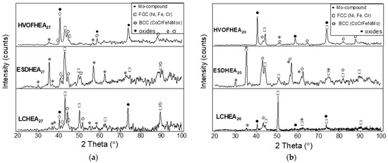 XRD scan of the as-sprayed (a) HEA_Mo27 and (b) HEA_Mo20 coatings with the different deposition techniques.