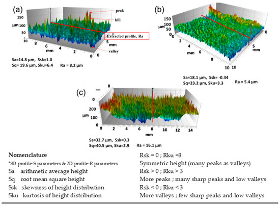 Three-dimensional topographic images and selected surface parameter of the as-sprayed (a) HVOF-HEA_Mo27 (b) ESD-HEA_Mo27 and (c) LC-HEA_Mo27 coatings.