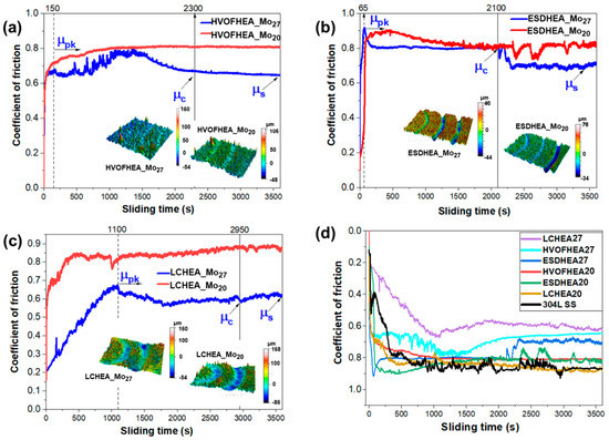 The representative coefficient of friction (CoF) curves of each as-sprayed HEAC with its deposition process as a function of time under the dry sliding is shown in Figure 9a–c. Figure 9d compares the CoF traces for all the HEACs and 304 SS substrate. Two time-dependent regimes characterized the fluctuations. From Table 5 and Table 6, the average values in these regions and that of the entire curves were compared with the value of stainless steel of 304 SS (0.80). On contact between the tribo-pairs under the applied load, an initial force is needed to alter the morphology of the contact zone for a continuous motion. The initial sliding period corresponded to breaking-in or running-in with the highest CoF value (µpk) shown on the friction curves. The running-in is related to the surface structures or morphology of the coating and the 304SS. The running-in was severe for all the HEACs and the steady-state was harder to achieve in the HEA_Mo27 than HEA_Mo20 coatings before coating run-through (µc). Figure 9a,b show a very short running-in stage for both the HVOF and ESD techniques with the least Ra values (i.e., 8.2 and 5.4) but recorded the highest µpk values (see Table 5). This may be attributed to a higher nominal/apparent contact area since, at the initial contact pressure, the area to load ratio is low during sliding (i.e., there is a low volume of material/asperity peaks above). However, this effect did not guarantee a high overall mean CoF value, implying an opposite general trend in which frictional response was controlled by the wear behavior of the coatings. Figure 9a–c shows these transitions (µpk, µc, µs) according to the friction behavior indicated lines (and arrows, only for Mo27 due to clarity).