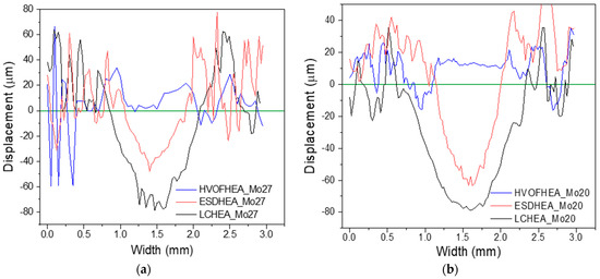 The topography profiles of the HEA coatings with the different deposition techniques after 12,000 wear cycles under dry test condition (a) HEA_Mo27 and (b) HEA_Mo20.