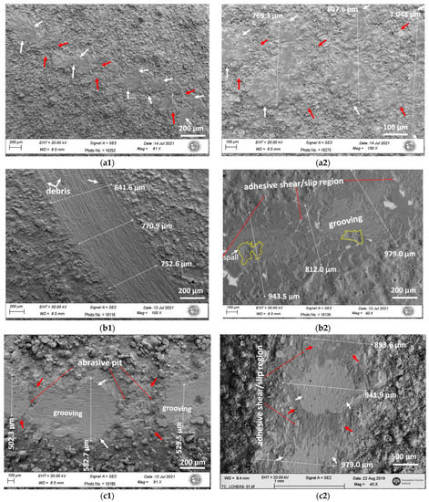 The surface SEM micrographs from the wear tracks are shown in Figure 12 and Figure 13, where wear characteristics for the two coating systems and three different deposition techniques can be seen. The red arrows indicate discontinuous regions in the tracks that were either minimally abraded (with oxide debris) or had no wear-forming abrasion pits. The white arrows point out the areas that experienced continuous smearing or scratching from the repetitive sliding of the coatings. The arbitrary track features on the coating surfaces were promoted by the high surface irregularities (Sa) and large thickness in LC HEAC. From the wear trace morphology in Figure 12(a1,a2), obvious oxide film was observed (indicated with white arrows) on the HVOF HEACs in the direction of sliding at room temperature, with HEA_Mo20 having the best film continuity. In comparison to the coatings prepared by the LC and ESD techniques, the micrographs revealed severe plastic deformation, glazed (adhesive) layer and oxide debris for the LC and ESD samples, as shown in Figure 12(b1–c2). Moreover, localized damage close to the contact area and a transfer film was observed on the counter body (see WC ball in Figure 11b).