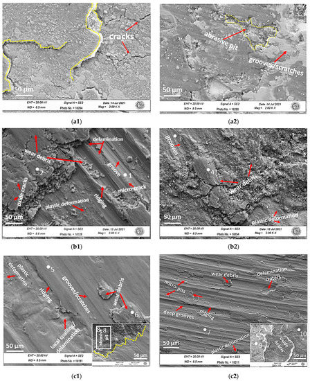 SEM micrographs of morphology of the wear tracks of the (a1) HVOF-HEA_Mo27, (b1) ESD-HEA_Mo27, (c1) LC-HEA_Mo27 and (a2) HVOF-HEA_Mo20, (b2) ESD-HEA_Mo20, (c2) LC-HEA_Mo20—CoCrFeNiMo coatings with the different coating techniques after 12,000 wear cycles under dry test condition.