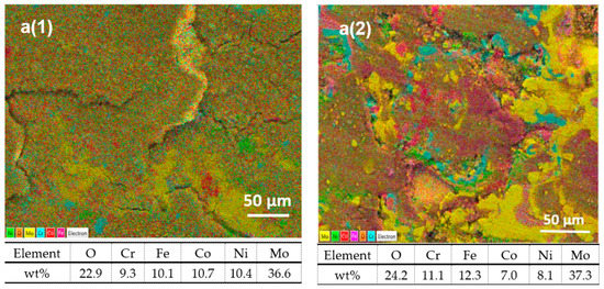 EDX mapping results (a) of the layer formed on the (a1) HVOF-HEA_Mo27 and (a2) HVOF-HEA_Mo20 as-sprayed coatings after 12,000 wear cycles under dry test condition.