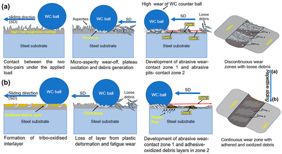 A schematic of the wear evolution proposed for the produced HEACs: (a) abrasive wear mode with plastic deformation and debris generation at the onset of sliding and (b) third body influence with subsequent decrease in the wear. Wear transition from mode (a) to (b) due to oxidation and repetitive sliding.