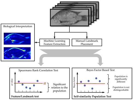 This is a strong shortcoming in contrast to landmark-based analysis, where the landmarks can be interpreted in a biological manner. The authors of [] compared landmark-based approaches to machine learning approaches for a Nile tilapia population classification task. The authors relied on supervised methods and found that the machine learning models, including CNNs, used image regions with no biological meaning that happened to be correlated with the specimen’s population. This effect is known as clever-Hans predictors [].