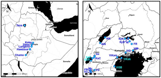 The locations in Ethiopia (left) and Uganda (right) used for this study. All images were also gathered in these locations. The cran R [] package rosm [] relying on the OpenStreetMap was used to generate the maps.