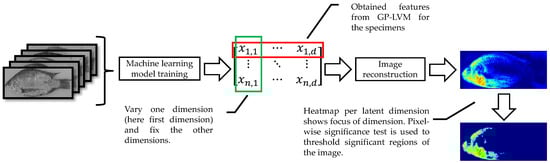 To visualize the visible characters learned by the B-GP-LVM, we applied the method of [,]. For this visualization of the D features, we generated n vectors for each features. In this vector, we fixed all dimensions to the expectation except for the d-th dimension, which was set to the true specimen value. Following this procedure, n vectors for each feature could be generated. These vectors were projected to the image space. We calculated the pixel-wise variance and interpreted the resulting image as a visualization of the latent features space. For the interpretation of the images, we applied the pixel-wise hypothesis test for saliency maps (heatmaps) previously introduced in []. The visualization procedure is visualized in Figure 5.