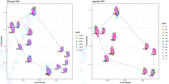The landmarks were manually placed on the digital images. Analysis for specimens from Ethiopia was based on 14 landmarks, while for specimens from Uganda it was performed with ten landmarks. The result of the GPA feature scaling is illustrated in Figure 6. For the purpose of visibility and readability, the water bodies of Victoria, Albert, Edward and Kyoga were visualized together.