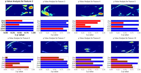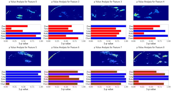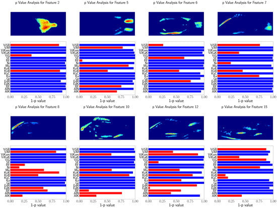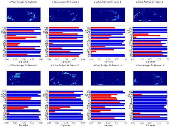 We followed the procedure proposed in [] and carefully selected biological informative features manually. After model optimization and model selection, we visualized the learned features using the aforementioned methodology. All features containing non-biological information were rejected and not used for further investigation. The remaining features were analyzed using Spearman’s rank correlation test [], where for each feature we used j and population k : There is no relation between feature j and the population k. For our visualization in the remaining part of this study, we showed instead of the p-value for the machine learning-based models.