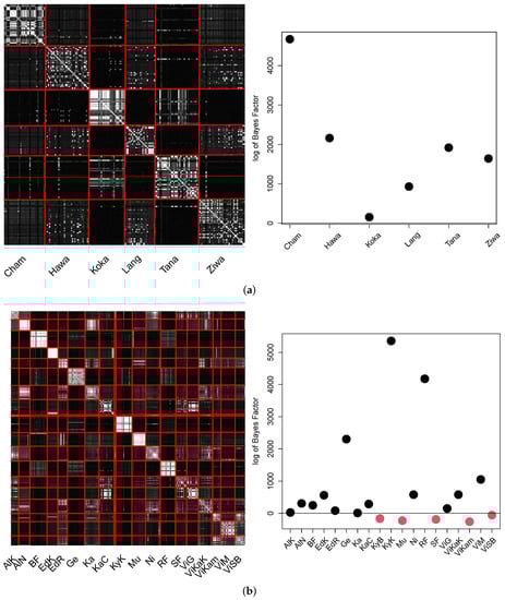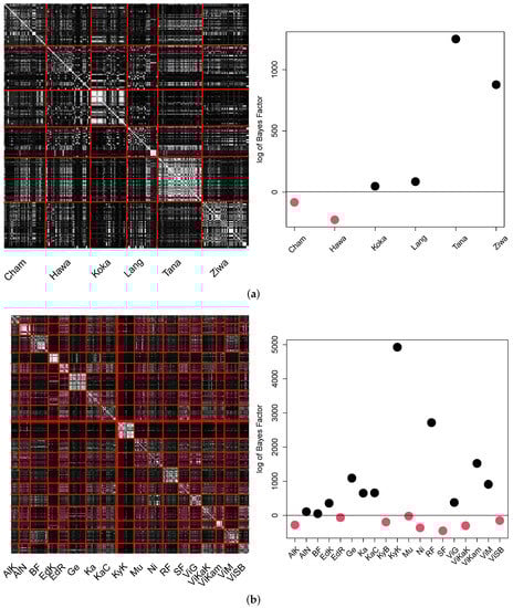 Our method was implemented in cran R []. For numerical stability, we analyzed the log of as well as instead of raw probabilities. We analyzed cluster partitions for Ethiopia and Uganda. To avoid numerical instabilities, we added a uniform distributed jitter using , which is the probability of to that the specimens are in the same population.