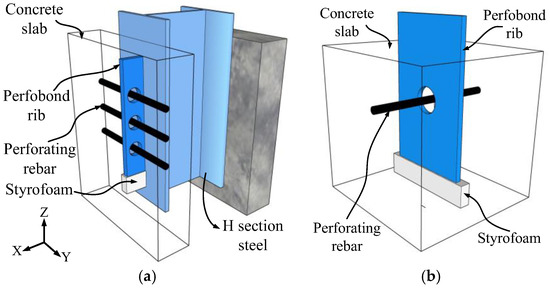 Steel–concrete composite structures are a new version of conventional steel and reinforced concrete structures. They combine the advantages of steel and concrete materials, offer improved mechanical performances, and yield better economic benefits. Connectors play a crucial role in realizing the combined properties of steel and concrete. At present, headed stud connectors are widely used [1,2]. Leonhardt et al. [3] first proposed a new connector (referred to as the perfobond connector), which was constructed by welding a perfobond rib to the flange of the steel beam and inserting the rebar through the hole. After the concrete is poured, the concrete dowel and perforating rebar in the hole can transmit the longitudinal shear force and resist vertical lifting between the concrete and steel. Previous studies have shown that perfobond connectors offer convenient construction, good shear performance, and superior fatigue performance [4,5,6]. Two primary types of perfobond connectors are currently in use: the superposed perfobond connectors for composite structures and the inserted perfobond connectors for bridge construction. Their structural forms are shown in Figure 1a,b, respectively.