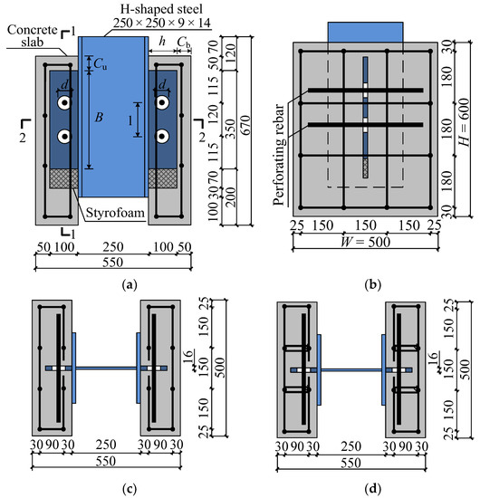 In this study, 12 superposed perfobond connectors were designed for push-out testing according to Eurocode 4 [28]. All the specimens were made of Q355 H-shaped steel and HRB400 ribbed bar. The specific parameters are shown in Table 1. Figure 3 shows a schematic diagram of the specimen; the height H, width W, and thickness T of the concrete slab were 600, 500 and 150 mm, respectively. The H-section specification was HW250 × 250 × 9 × 14. The height h, length B and thickness t of the perfobond rib were 100, 350 and 16 mm, respectively. Cu and Cb were the thickness of the concrete wrap at the top and side of the perfobond rib, which were all 50 mm. The main design parameters included the lateral constraints and hole areas of the perfobond rib. The lateral constraints were mainly affected by the concrete compressive strength, diameter of the perforating rebar, and the number of transverse reinforcements. The hole area was changed by varying the hole’s diameter and shape. The design specifications of the perfobond rib are shown in Figure 4 and Table 1, thereinto, d, dl, dh and A were the holes’ diameter, length, height, and the areas of the perfobond rib, and l was the distance between the holes. ds was the diameter of the perforating rebar. The transverse reinforcement number was varied via the stirrup forms of the concrete, which included both conventional (see Figure 3c) and segmental (see Figure 3d) stirrup constraints.