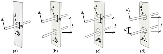 Diagrams of the perfobond ribs: (a) Perfobond rib with single hole; (b) Perfobond rib with two holes; (c) Perfobond rib with long-holes; (d) Perfobond rib with high-holes.