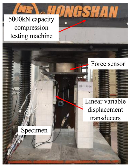 The push-out test was performed on a 5000 kN testing machine under monotonic static-loading conditions. The loading device is shown in Figure 5. The vertical load was applied to the upper part of the H-shaped steel beam at the center of the specimen via the displacement loading method, which was specified in Eurocode 4 [28]. As such, the specimen was first preloaded, then uniformly loaded at a rate of 0.2 mm/min. Loading was stopped when the loads fell to less than 80% of the ultimate value or the displacement reached its limit. The entire loading process took no less than 15 min. A thick steel plate was placed on the top of the H-shaped steel beam to ensure a uniform force on the specimens. The data acquisition frequency was about 2 s/datum.