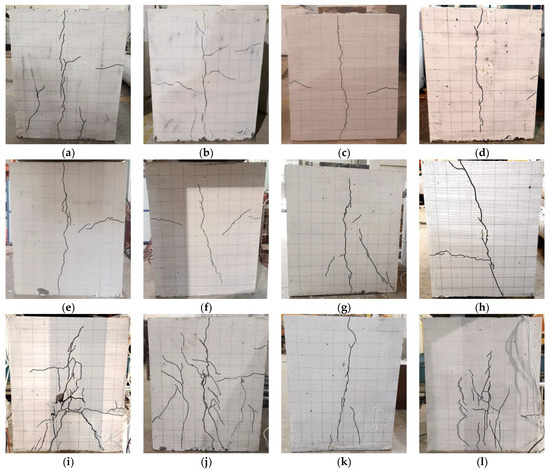 Cracking patterns of the concrete blocks: (a) P-1; (b) P-2; (c) P-3; (d) P-4; (e) P-5; (f) LP-1; (g) HP-1; (h) NP-1; (i) SP-1; (j) CP-1; (k) CP-2; (l) CP-3.