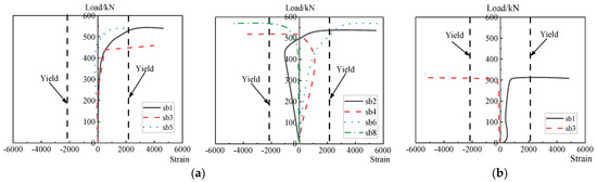 The strain around the hole, relative slip between the steel and concrete, and axial strain through the steel bar were the main measurement focuses of the test. The actual layouts are shown in Figure 6. A force sensor was placed at the top of the specimen to collect the load value during loading. The relative slip between the H-shaped steel and concrete slab was measured by four linear variable displacement transducers arranged symmetrically on the specimen, which were numbered D1–D4 (see Figure 6a). The average value between these four displacement gauges was taken to ensure accuracy. The strain values around the opening of the perfobond rib were measured by the strain rosettes numbered sp1–sp9 (see Figure 6b). The strain of the perforating rebar was measured via the strain gauges arranged on the perforating rebar, which was numbered sb1–sb8 (see Figure 6c).