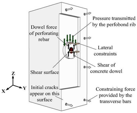 The connectors featuring the three different hole shapes exhibited the same shear failure mode; therefore, the shear failure mechanism can be investigated by using the circular hole as a typical example, as shown in Figure 12a. The load was first transferred to the concrete dowel through the partial bearing surface, and this was associated with compression deformation of the concrete between the perfobond rib and perforating rebar. When an increasing load was transmitted to the rebar, bending and shearing deformation occurred throughout the reinforcement, in response to which the vertical and axial forces of the rebar provided shear resistance and constrained the concrete dowel, respectively. Meanwhile, the load was transferred to the surrounding concrete in the form of a shear load through the shear plane. This indicates that the concrete in the hole undergoes a tri-axial compression through the perforating rebar, the perfobond rib, and the surrounding concrete [20,22]. During cracking, the concrete wrapping and transverse reinforcement produced lateral constraints on the concrete dowel, alongside the axial force through the reinforcement.