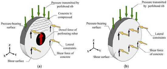 The strain analysis results for the perfobond rib (Figure 9) show that the steel plates underwent no notable deformation; this suggests that the failure modes of the concrete dowels and perfobond rib should be the primary focus when studying the shear mechanism. Using the inner failure states of the connectors in Figure 8 and the data measured in the test, the force-transfer mechanism of the connector was analyzed using a single hole as an example. As shown in Figure 11, the vertical load acting upon the steel was transmitted to the concrete dowel via the local bearing surface between the perfobond rib and concrete, and subsequently transferred to the surrounding concrete through the shear concrete surface and perforating rebar, in the form of shear load. Owing to its dilatancy, concrete not only provides a shear bearing capacity but also produces an additional horizontal dilatancy effect, which is constrained by the surrounding concrete, the rebar in the hole, and the transverse steel bar [11,12], namely “lateral constraints” in this paper. Previous studies have found that lateral constraints significantly determine the bearing capacities and failure modes of connectors [11,12,25,26,30]. Therefore, the shear mechanisms of perfobond connectors can be classified into two categories: those with and without a perforating rebar.