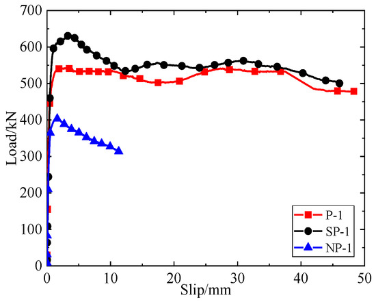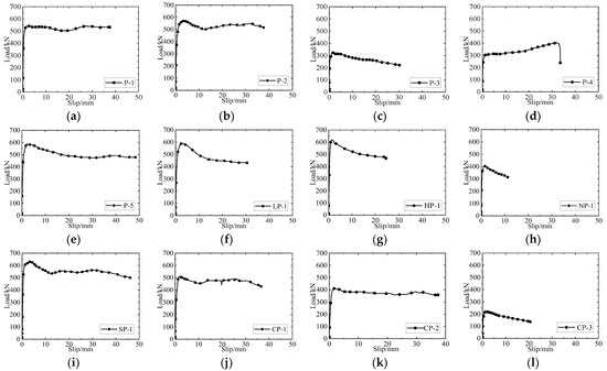 Load–slip curves: (a) P-1; (b) P-2; (c) P-3; (d) P-4; (e) P-5; (f) LP-1; (g) HP-1; (h) NP-1; (i) SP-1; (j) CP-1; (k) CP-2; (l) CP-3.