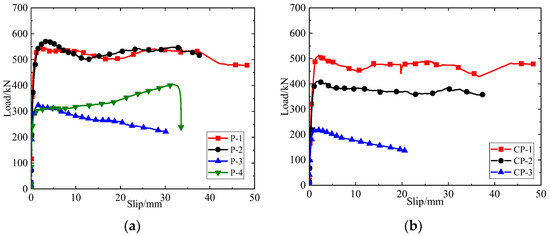 Figure 14 shows that the increase in the perforating rebar’s diameter not only enhances the shear capacity but also significantly improves the load-holding capacities of the connectors. Specimens P-1 and CP-2 feature connectors with 16 mm-diameter perforating rebars, and Specimens P-2 and CP-1 feature connectors with 20 mm diameter perforating rebars; their capacity decreases slowly after reaching the peak load, and the load–slip curves all remain fairly stable until the end of loading; thus, the load-holding capacity of the connectors is reasonably good. On the other hand, when the bearing capacities of the P-3 and CP-3 connectors (without perforating rebar) reach their peak value, the bearing capacity declines prominently as loading progresses, soon falling to 80% of the peak value. Hence, the load-holding capacity of these connectors is poor.