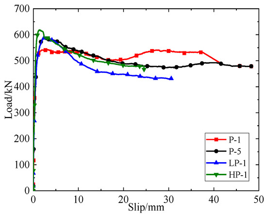 According to the characteristics of the load–slip curve, the static performance indexes of each specimen were calculated, as shown in Table 4. Considering the mechanical differences between specimens, the values of the performance indexes were stipulated as follows: the ultimate bearing capacity Pu was the maximum load during the test; for Specimen P-4, which did not exhibit a descending section in its curve, the ultimate bearing capacity Pu was the corresponding load when the slip reached 20 mm [33]; according to EC4 [28], the characteristic value PRk was defined as 0.9Pu; the design value PRd was computed according to