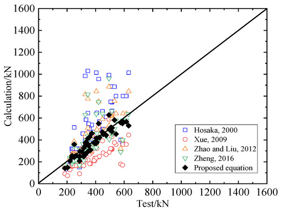 To further verify the accuracy of the shear capacity equation proposed in this paper, the shear capacity of all specimens listed in Table 5 was calculated using Equation (19) and compared with the calculations of Equations (2)–(5). The overall standard deviation coefficient between the calculation results of Equation (19) and the corresponding experimental results was 0.14, and the mean value was 0.99. As shown in Figure 19, the proposed equation outperformed the existing calculation methods, especially for the shear capacity of multi-hole perfobond connectors. Meanwhile, for Specimens III [22] and PS-22 [23], the deviation remained relatively large. One reason for this is the inconsistent specimen design method. Another is the discreteness of the perfobond connectors lacking a perforating rebar. Therefore, more push-out tests designed with uniform methods are required. To conclude, the shear capacity calculation equation proposed in this paper for multi-hole perfobond connectors under lateral constraints exhibits a smaller error and is more universal than those previously obtained.
