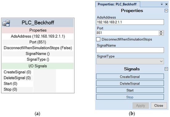 In this section, a description of the PLC_Beckhoff SC user interface is provided. In the RS environment, a SC interface is subdivided into Properties and I/O Signals, as shown in Figure 3. Concerning the I/O section, four default signals were provided as pulsed type, in order to appear to the user as buttons to activate signal management functions, namely CreateSignal, DeleteSignal, Start and Stop. These signals’ names are reserved and therefore excluded from the exchange mechanism via ADS communication. They are used to operate and configure the SC to create a new signal with a given name, delete a signal, start an ADS connection, and stop the connection, respectively.