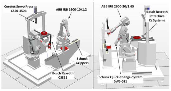Finally, the VC was analyzed as a means to optimize the sequence of the operations coordinated by the PLC. The absence of collisions between two robots sharing their workspace (see Figure 10), the interchangeability of the single assembly operation, and the possibility to parallelize actions performed in different zones of the cell make the solution space of all of the possible operating sequences quite vast. This opens up to the possibility of optimizing the order of the operations requested of the two robots and other devices in order minimize the overall accomplishing time.