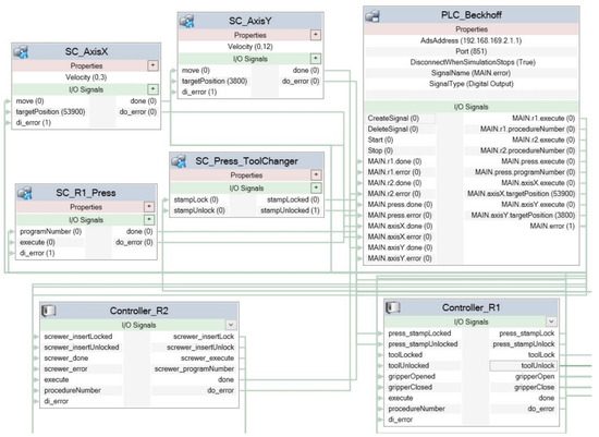 Figure 5 shows the appearance of PLC_Beckhoff SC connected to the cell devices, as the configuration stage of the cell is completed according to the signal pattern explained above. The signal exchange is based on a simple remote procedure call (RPC), i.e., a client–server interaction implemented via request–response messages. This pattern is able to safely manage complex scenarios in a standardized manner.
