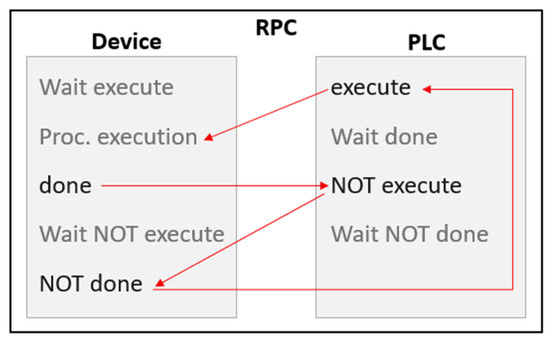The same logic is applied to devices and robots, leveraging respective controllers’ codings means to handle the signals’ exchanges. For instance, in the specific case of an ABB robot, the RPC scheme is managed by a main loop operating in the RAPID code, i.e., the code running in the robot controller. As shown in Figure 7, the robot acts as any other device: it receives an execute command from the PLC and it returns a done signal when the requested procedure is finished. As reported in the following pseudocode (Algorithm 3), the algorithm running on the robot controller includes a standard Main section with a loop implementing the RPC pattern. The code ensures the management of the exchanged signals and the invoking of the desired procedure according to the value of the procedureNumber.