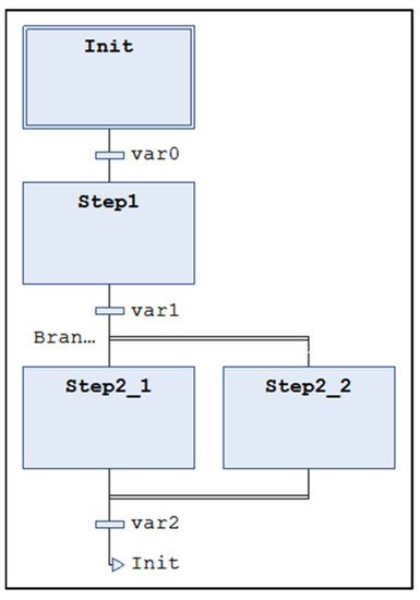 In Figure 8, a simple diagram is shown as an example to recall the basics of SFC. The Init block with the double outline is the entry point of the program. The little rectangle below, linked by a vertical line, represents a transition, i.e., a step forward in the graph execution flow; the related condition is pointed out by the label beside it. Until the transition condition is not verified, the program cyclically executes the code included in the specific block. When the condition expressed in the label is met, the execution of the program will pass to the next block, and so on. In the SFC, it is also possible to make the program execute two or more blocks in the same cycle, using a parallel branch. In the example shown in Figure 8, after var1 has become true, Step2_1 and Step2_2 are both cyclically executed until the variable var2 becomes true. Finally, the arrow indicates a jump, meaning that the program execution is brought back to the block named as the label next to the arrow.