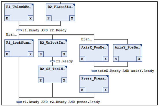 In the robotic assembly cell test case, the SFC programming language has been employed to program the PLC. Figure 9 reports a portion of the program to show the logic used to build it. Each block of the diagram corresponds to an operation of a certain device. The features of the SFC, i.e., parallel branches, allowed the activities, which must be performed at the same time, to be managed. For instance, AxisX and AxisY are supposed to be moved simultaneously in order to reach the target position of the table in the minimum amount of time. On the contrary, the press must be actuated only when the table reaches the target position, as required by the sequential constrain that is expressed by the transition condition named Ready.